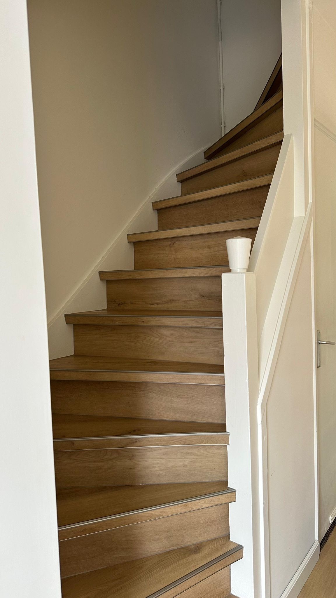 De gekozen kleur sluit naadloos aan bij het interieur en zorgt voor een warme, moderne uitstraling. De trap is zorgvuldig bekleed met op maat gesneden stroken, wat resulteert in een strak en afgewerkt eindresultaat.